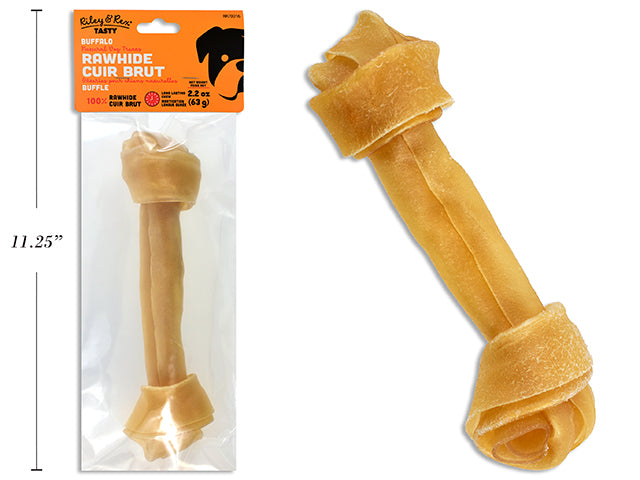 Carton of 24 7in - 7.5in Buffalo Rawhide Knotted Bone. 65g/pc. PVC Bag w/Header Card.