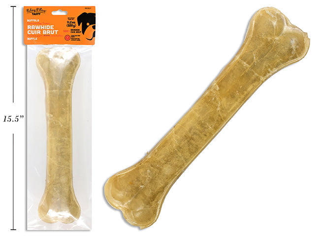 Carton of 24 12in Buffalo Rawhide Pressed Bone. 330g/pc. PVC Bag w/Header Card.