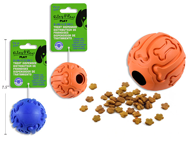 Carton of 12 96mm 2-in-1 Rubber Fetch Ball Treat Dispenser Dog Toy. 2 Asst.Colours. h/c.