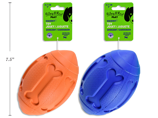 Carton of 12 5in Rubber Fetch Football Squeaky Dog Toy. 2 Asst.Colours. h/c.